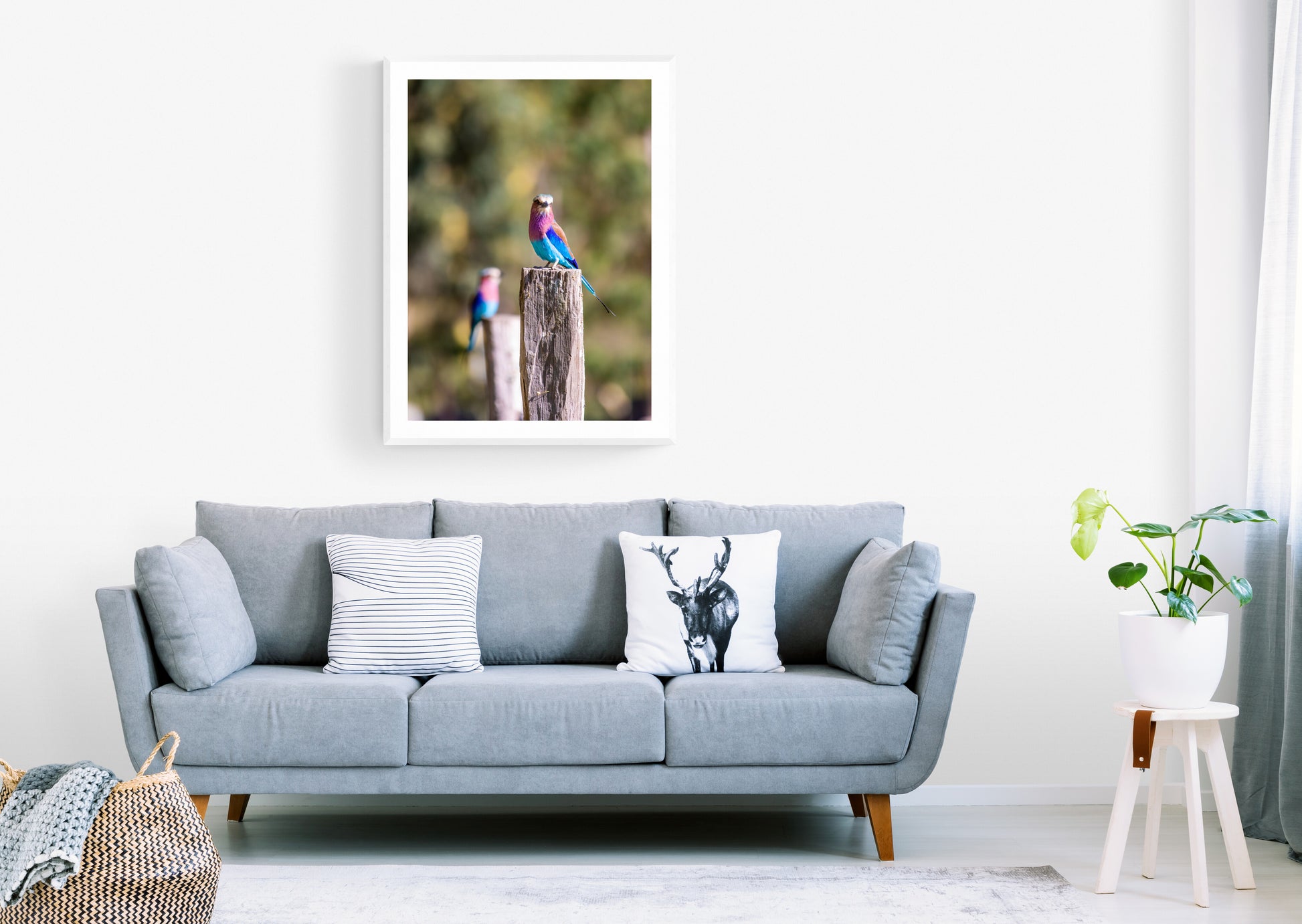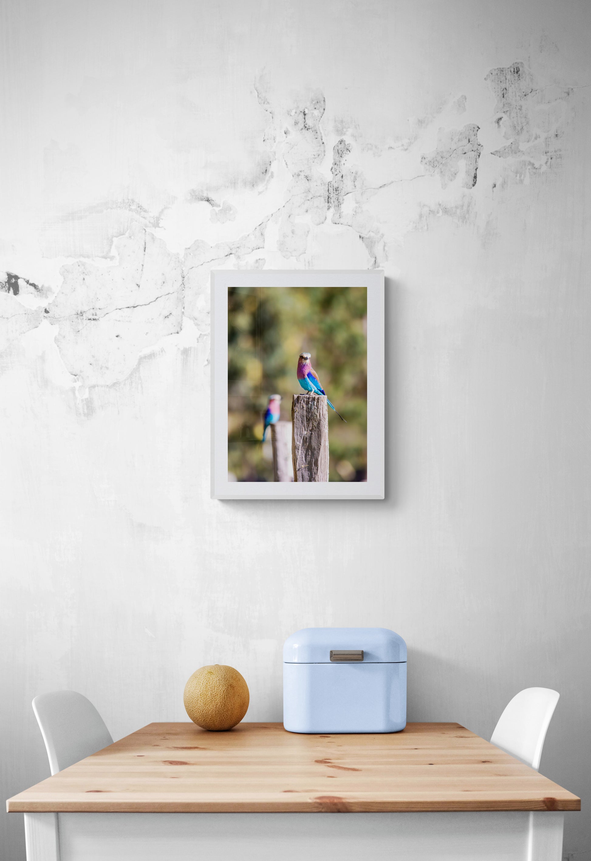 While on safari in Kenya, I spotted a pair of lilac-breasted rollers perched on some fence posts, their colours glowing in the sunlight. Their vibrant plumage — a mix of lilac, turquoise, and blue — stood out beautifully against the green back drop.